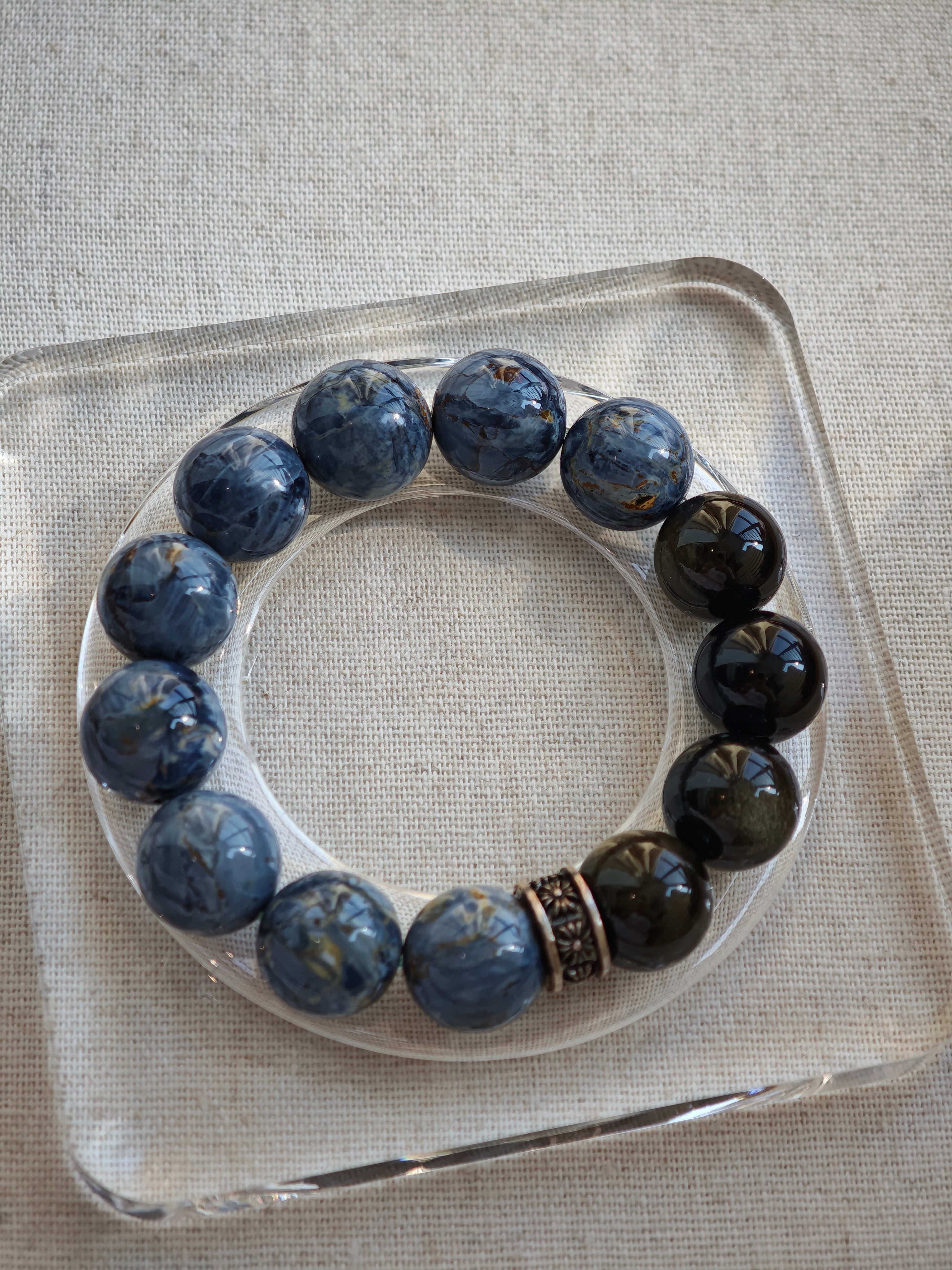 Introducing the Blue Denim Dream Pietersite Bracelet – a masterpiece of nature and artistry. Meticulously handcrafted with striking 14mm Pietersite beads and grounding Golden Sheen Obsidian, accented by sleek silver spacer. This exquisite natural crystal blend creates a mesmerizing denim-blue hue, radiating both sophistication and mystical energy.