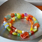 Handmade by 2Sonder, this mesmerizing glass bead necklace dances with Maillard ombré beads in whimsical shapes and vibrant hues. Like crystallized candy, each bead shimmers under sunlight, creating a rainbow necklace that captures summer’s magic. Paired with a sterling silver lobster clasp and extender chain (base length: 45cm), it’s your perfect everyday necklace for brunches, dates, or travels.